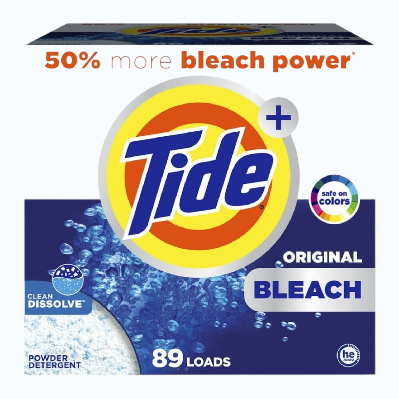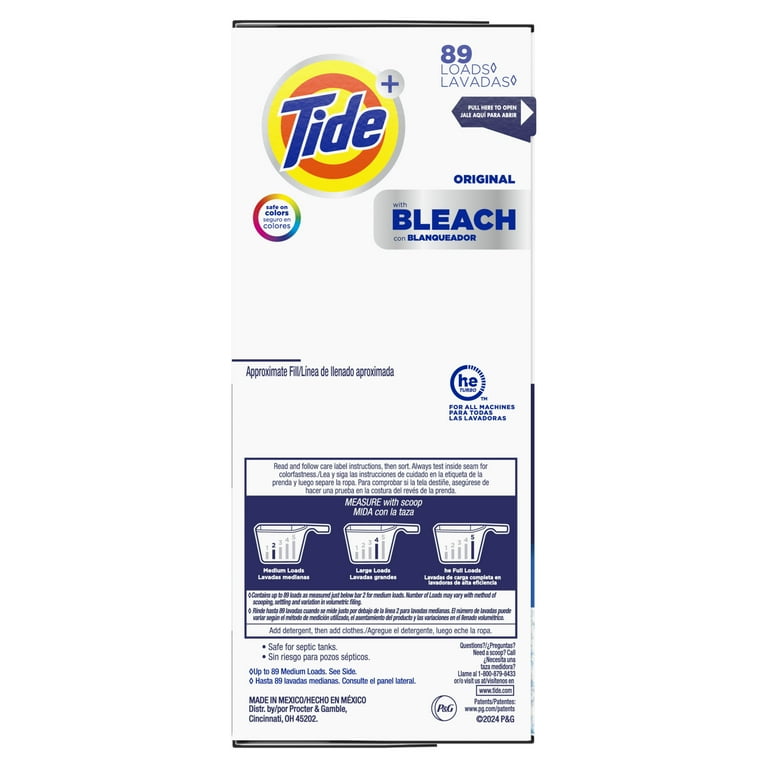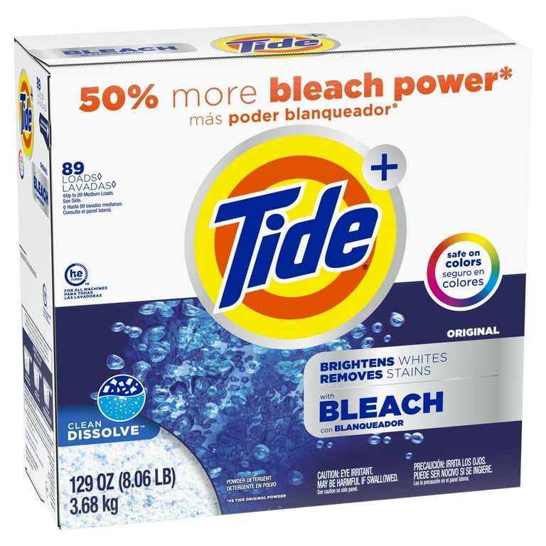 Tide Original Bleach Powder Detergent, 89 loads, with a bleach-enhanced formula designed for effective everyday laundry cleaning, reliable stain removal and brighter whites.
