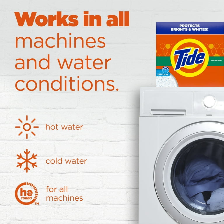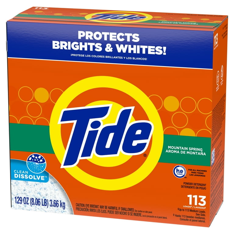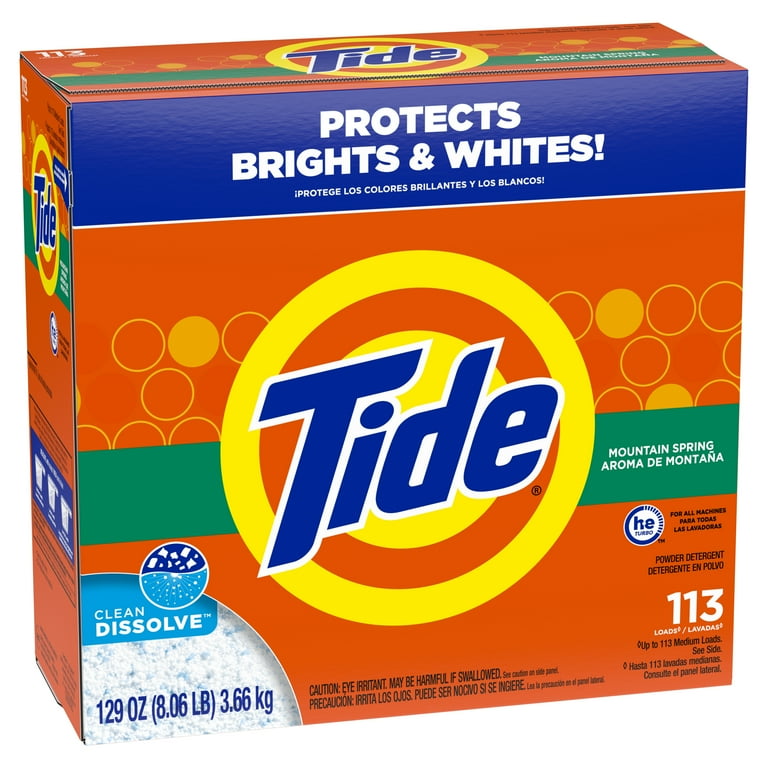 Tide Powder Detergent Mountain Spring, 113 loads, with a fresh scent formula designed for effective everyday laundry cleaning and reliable stain removal.
