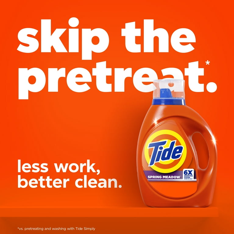 Tide Spring Meadows Liquid Detergent, 80 loads, with a powerful stain removal formula designed for effective everyday laundry cleaning and fresh spring scent performance.